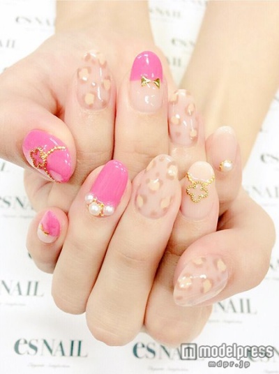 鮮やかなピンクと合わせたシアーベージュのレオパードは華やか。強烈な印象を与えるレオパード柄が一変、品のある女性らしい印象を与えてくれます。