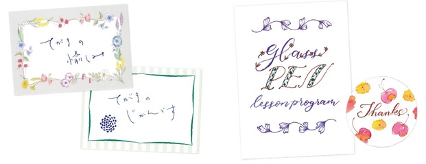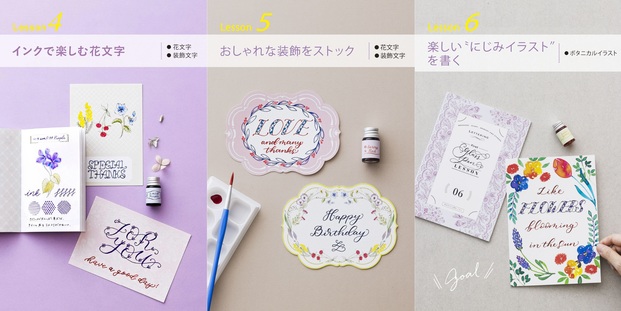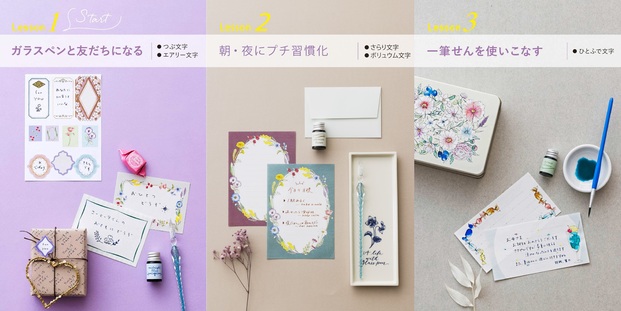 毎月1レッスンずつ届き、半年間たっぷりとガラスペンの世界を楽しめます。2人の文字のプロによるレッスンで、日本語、アルファベットだけでなく、花文字やイラストまでマスターできる充実した内容です。フォントはすべて、このレッスンのためのオリジナルなんだとか。