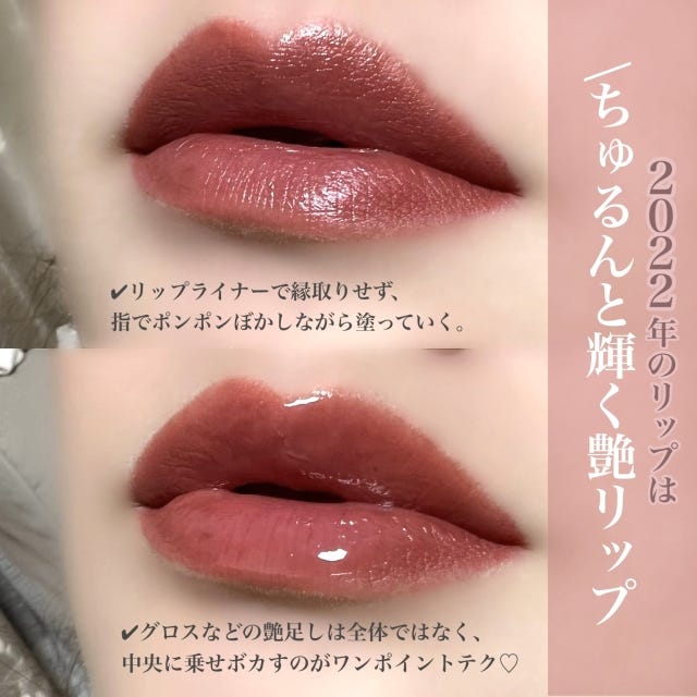 30代の大人女子なら、うるうるとたっぷりと乗せすぎるのは下品にうつってしまうかも。中央にだけグロスを重ね、こちらも指でボカせば上品な輝きを楽しめますよ。
