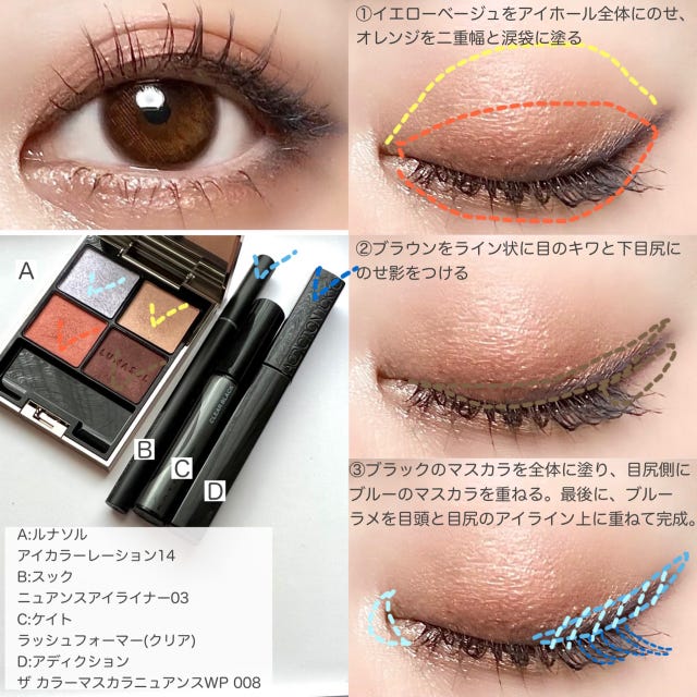 カラーマスカラやカラーライナー、アイシャドウなど色々なブルーアイテムがあると思いますが、ポイントで使えばナチュラルに抜け感が出てお洒落な目元に仕上がりますよ♡