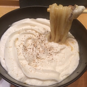 このお店で外せないのが和ダシの効いたカルボナーラうどん。