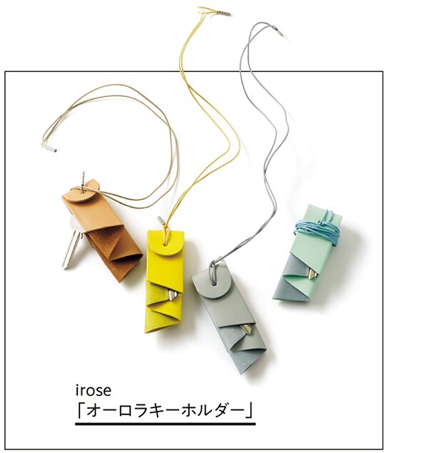 オーロラをイメージした形状のキーホルダ ーは、1枚の革を折り畳んだシンプルな構造をしています。