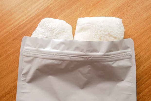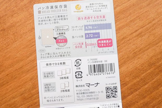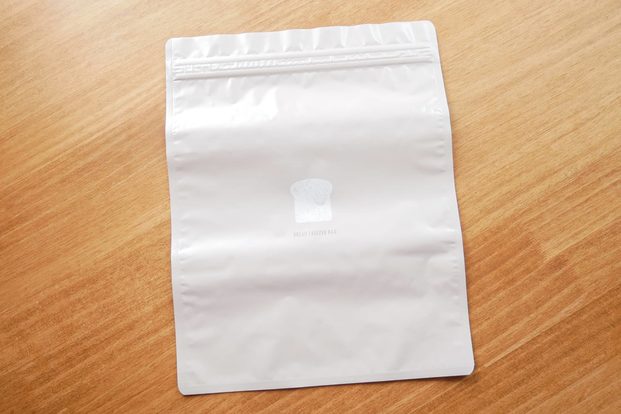 アルミを挟んだ三層構造になっており、フリーザーバッグや食パンの袋とくらべると、袋を透過する空気量が圧倒的に少なく、冷凍庫臭がつきにくいとのこと。