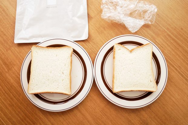 そこで、ラップを使わずに「パン冷凍保存袋」に保存したものと、ラップで包んだ食パンを冷凍して、その違いを検証してみる。