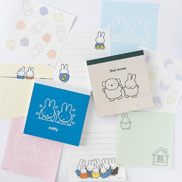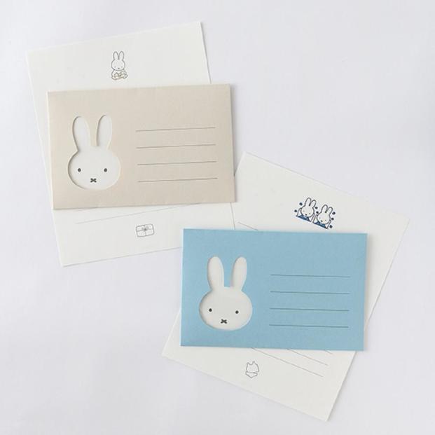 便箋を封筒に入れると、ミッフィーのお顔が完成する仕掛けのレターセット。便箋のワンポイントが、それぞれ異なるイラストになっています。