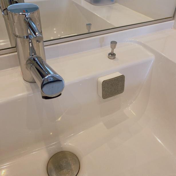 つるつるの白い面がシンクにピタッと張り付いてくれるのでスポンジをわざわざしまう必要なし。ということは、洗面所を使った『ついでに』さっと掃除ができちゃうんです!これが何よりも『楽!!』。いちいちどこからかスポンジと洗剤を持ってきて洗おうと思うと、毎日やるのは面倒くさいって思いますよね?でも手を洗った後に、歯を磨いた後にさっとお掃除できちゃうので面倒臭がり屋さんにもぴったり!現に私はこれを設置してから毎日掃除出来ています!