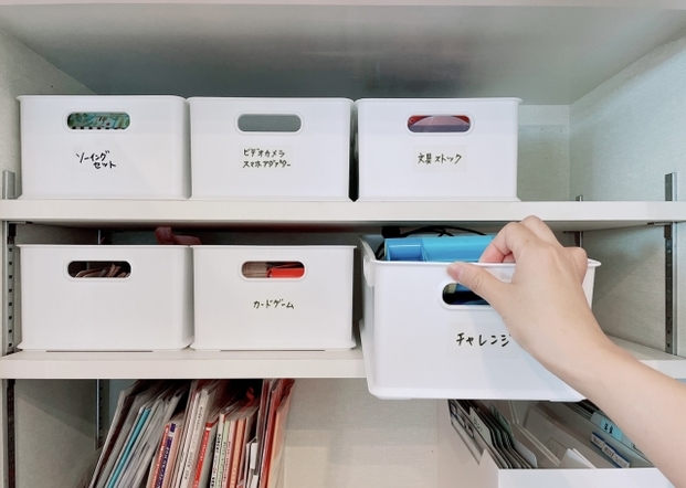 探し物を減らすためには、家の中のすべてのモノの定位置を決めることが大事です。上の写真のように、ラベリングをすると、だれが見てもどこに何が入っているか分かります。