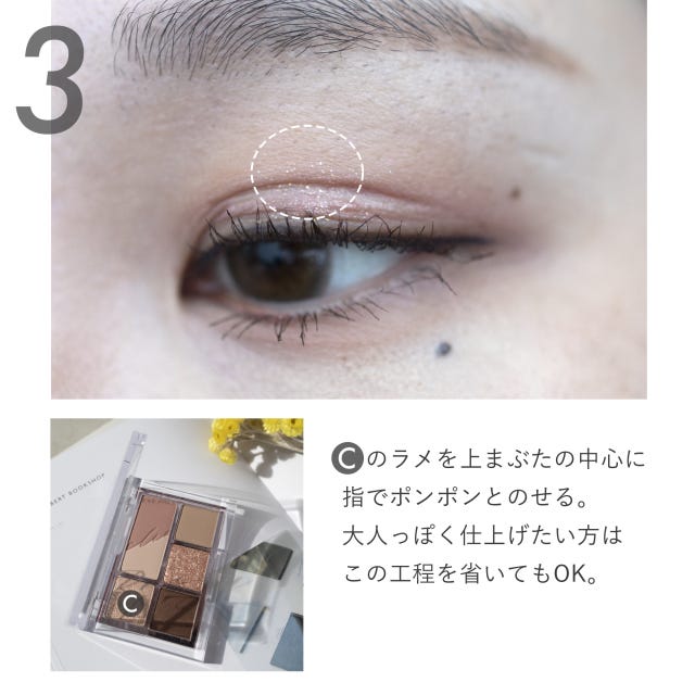 Cのラメをほんの少しだけ指にとり、上まぶたの中央にのせます。