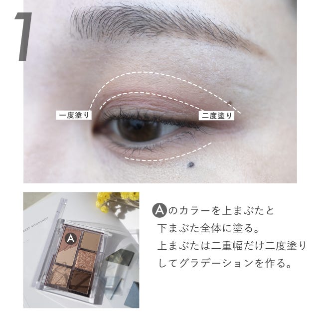 Aのシャドウをブラシにとってアイホール全体に塗ったら、さらに二重幅だけもう一度同じカラーを重ねます。