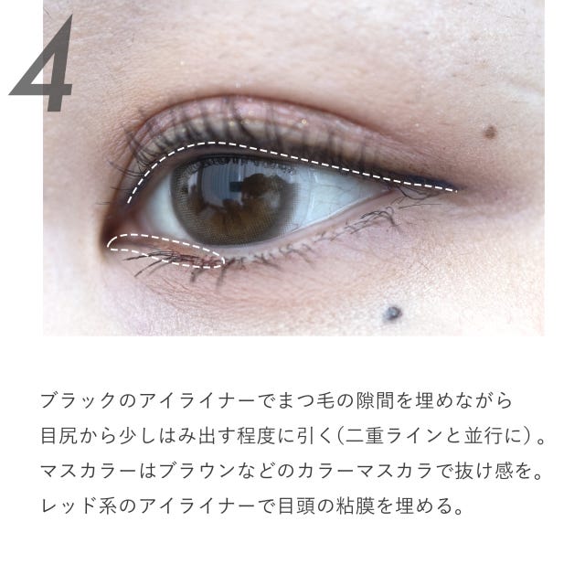より目力をアップさせたい方は、目頭の粘膜部分をレッド系のアイライナーで埋めると、ナチュラルに目力がアップします。