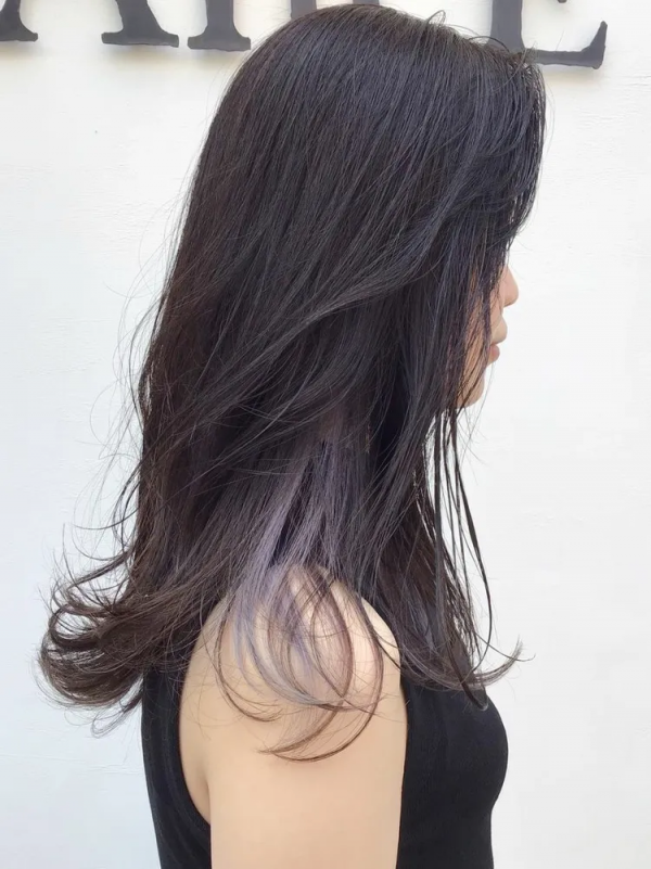 こちらは黒髪に近い暗髪のベースに、明るめのグレーパープルのインナーカラーを入れています。