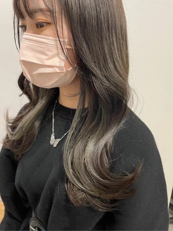 全体はブリーチなしでアッシュ系の髪色に仕上げ、インナーだけブリーチをしてオリーブ系のカラーを入れています。