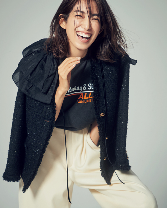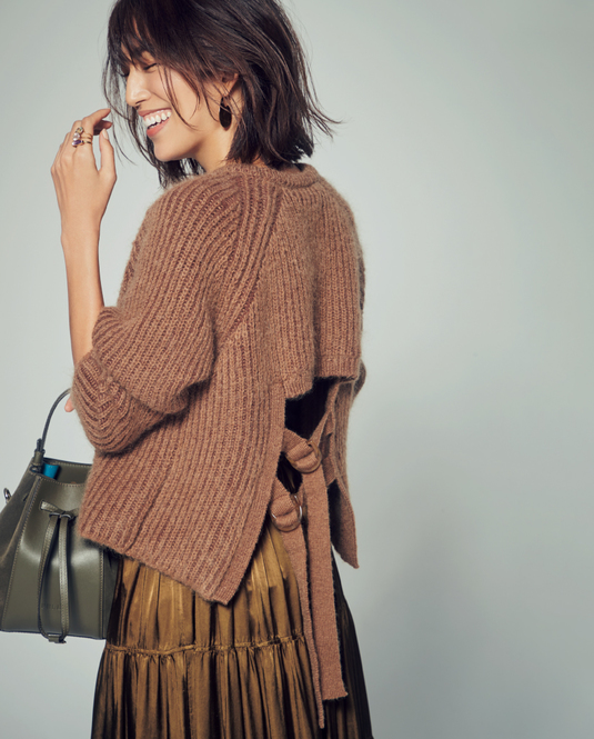 ファンシーヤーンを使ったふっくらとした触感で、編み地も複雑で、後ろに凝ったデザインがあってこの価格。スカートにもパンツにも合わせやすい絶妙丈なので着用頻度が自然と増えそう。ニット ¥11,000(ノール・ケアド)スカート ¥33,000(ダブルスタンダードクロージング/フィルム)バッグ ¥62,700(フルラ/フルラ ジャパン)ピアス ¥35,200(プリーク/エイチ ビューティ&ユース)リング上から ¥9,790、¥9,790、¥8,690(すべてオデュール/ödül)
