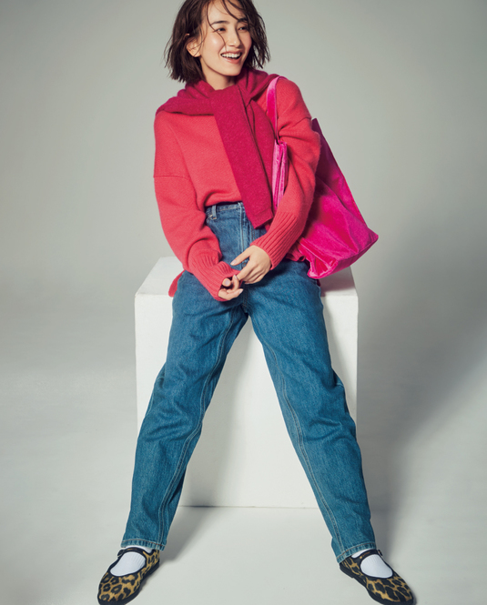 こだわりデニムブランドでしか見つからなそうな超ハイウエスト。腿から裾にかけて丸みのあるシルエット。穿くだけでオシャレに見える1本が2千円台!デニムパンツ[ハイウエストマムジーンズ]¥2,490(ジーユー)ニット ¥88,000 バッグ ¥9,900〈ともにユナイテッドアローズ〉肩にかけたカーディガン ¥38,500〈スローン〉(すべてユナイテッドアローズ 六本木ヒルズ店)シューズ ¥19,800(ドロゲリア クリペリーニ/イウエン マトフ 横浜店)ソックス[3足セット]¥1,430(ニューエラ)