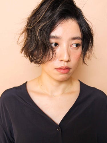 ウェーブをつけたショートボブは、全体がダークトーンのグレージュカラー。