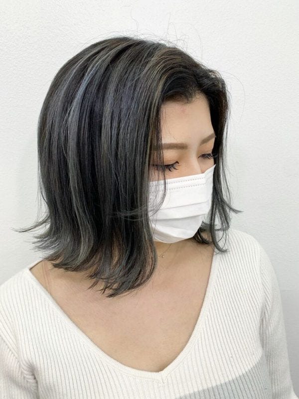 バレイヤージュと呼ばれる技法を用いて、ワンレングスボブに立体感をプラス。黒髪と暗めのグレージュのバランスが大人っぽい表情です。