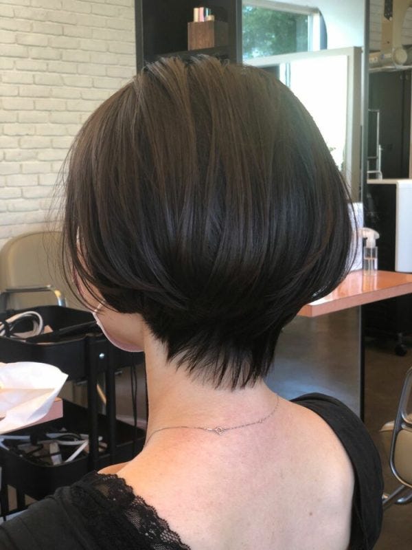 前髪は長め、後頭部にはボリュームを出したショートボブは、前髪のアレンジによって表情をいろいろ変えられるのでおすすめです。