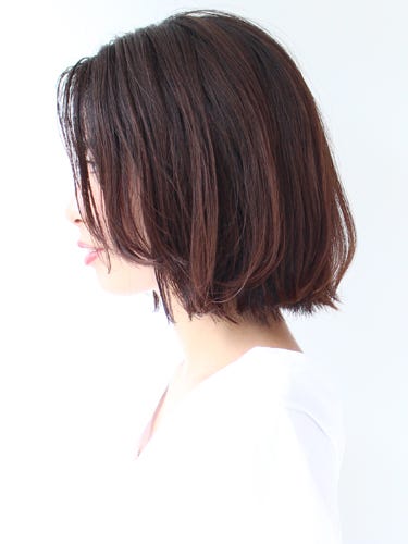 あご先までのワンレングスボブを、かき上げバングで大人っぽくスタイリングしています。