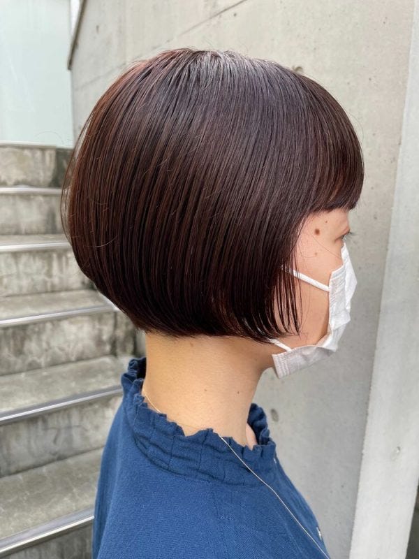 後頭部に丸みをつけたマッシュボブは、前髪を厚めに残して大人可愛いバランスをキープしています。
