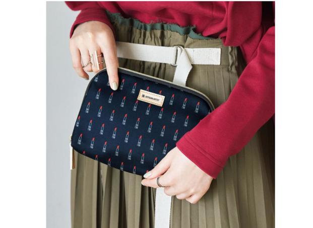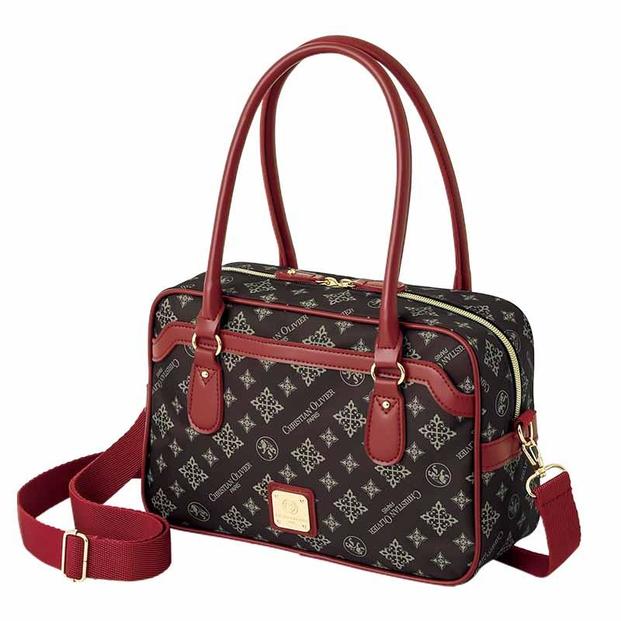 付録は人気のモノグラム柄のボストンショルダーバッグです。ダークブラウンカラーにワインレッドのポイント使いが目を引きます。肩掛け以外に付属のショルダーストラップを使うと斜め掛けもできます。