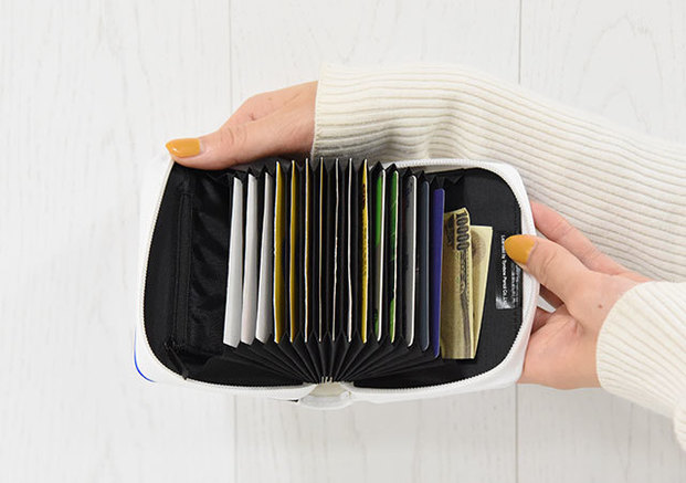中はガバッと開くじゃばら式になっていて、最大30枚のカードを収納できますよ。
