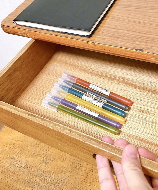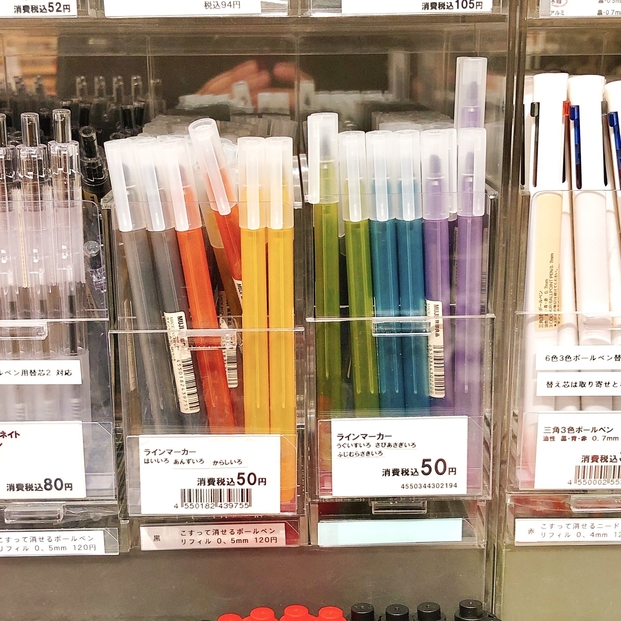 「蛍光ペンはビカビカしていて苦手…」そんな方に無印良品の「ラインマーカー」がオススメです。うぐいす色やふじむらさき色など、和をモチーフにした目に優しいマーカーなんです。しかも一本50円というお手頃価格。勉強はもちろん、イラストにも使えますよ!