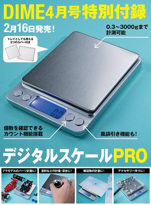 DIME4月号の付録は、0.3g〜3000gまで量れるデジタルスケールPRO。郵便物やフリマアプリの出品物、釣り具やアクセサリーパーツの計量などに役立ちます。専用のトレイも同梱されており、風袋引き機能や個数カウント機能も完備でこの価格は驚きです!