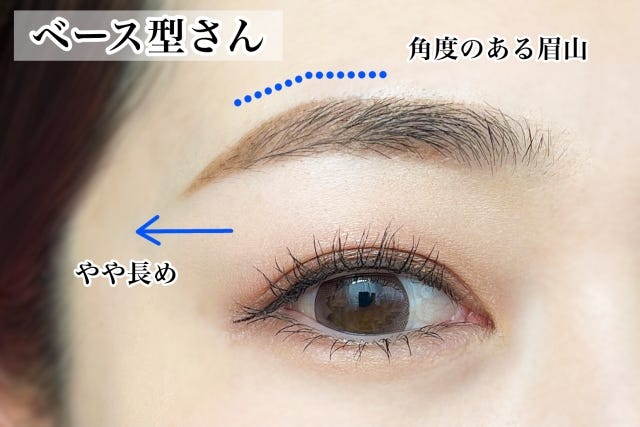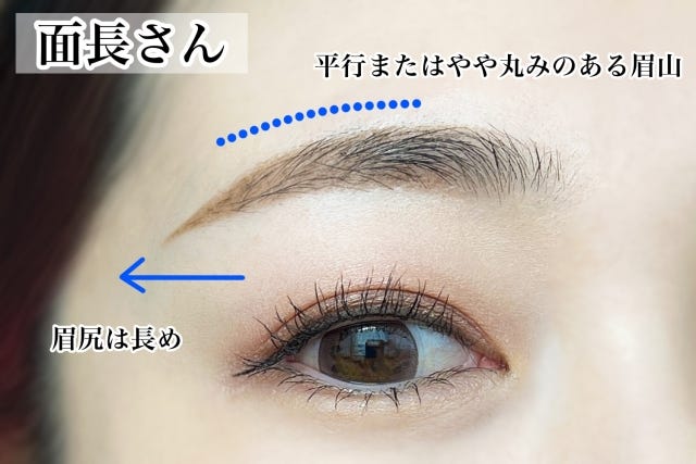 面長さんはメイクでも縦を強調するようにせず、横に目線が向くようにすると良いです。眉山は平行〜角度のあまりつけていないアーチ型で眉尻は長めに描くようにしましょう。