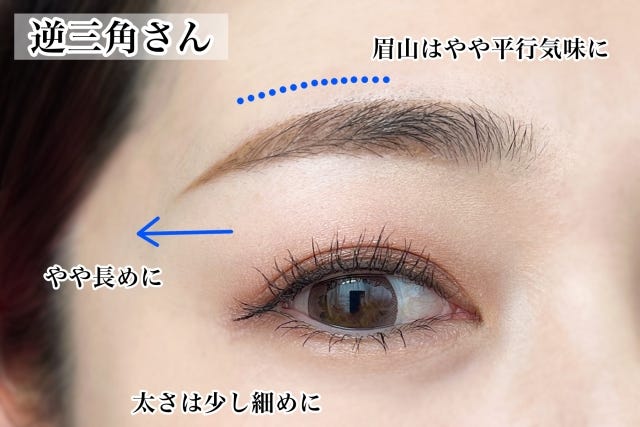眉山から眉尻が角度がついていると逆三角形の輪郭を強調してしまいがちになります。眉は平行気味に、眉尻は角度を付けず横に流すようにします。