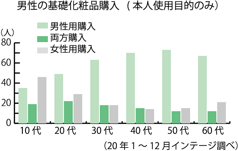インテージの全国消費者パネル調査(集計期間は15~19年)によると、基礎化粧品(スキンケア)の購入は10代の66%、20代の55%が女性用を購入している結果となった。男性のコスメに対するニーズと従来の男性用化粧品とのずれが生じ、女性向けに近づいていると思われる。女性用の情報量や商品バリエーションの多さも反映していると見られている。同調査によると40~60代の男性の男性用化粧品の購入率が特に上昇している。スキンケアを始める人が増えてきたとの見方だ。