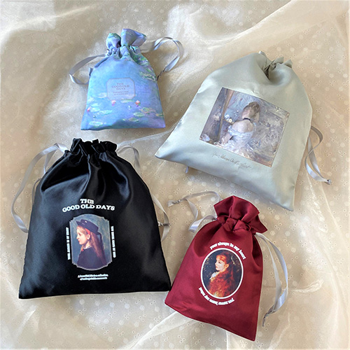 モネの睡蓮が一面にえがれたサテン巾着は必見