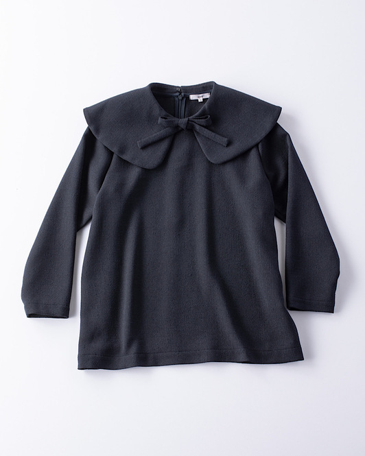 まるでケープのような大きい丸襟や、トレンドを押さえたツイード素材がオシャレ。広めの身幅に加え、ストンと落ち感のあるシルエットで華奢見え効果が期待できます。後ろにファスナーが付いていて着脱も楽ちん。ブラウス¥22,000(yori)