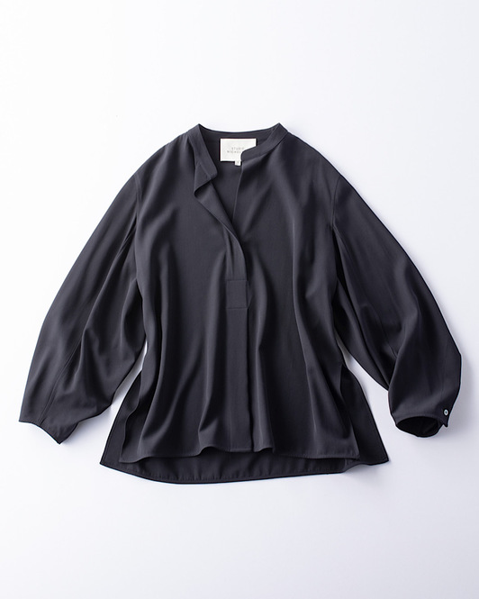 季節もシーンも問わずに楽しめる、ミニマルなベーシックウェアが豊富な「ソージュ」。ツヤのある上品な生地ですが、程よい伸縮性があり着心地◎。前より後ろが長いアシンメトリーな裾で体型カバーを実現してくれます。ブラウス¥14,300(ソージュ/ソージュ オンラインストアカスタマーサポート)