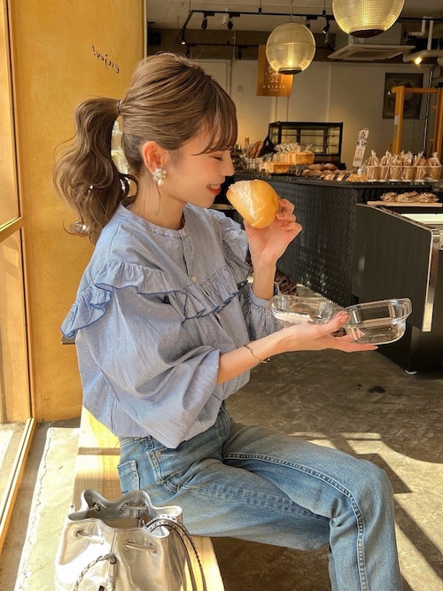ぐるりと360度フリルが施されたブラウスは、デニムスタイルをほどよく甘めに仕上げてくれます。まだ寒いうちはタートルを中に仕込んだりカーディガンと合わせたりと、色々アレンジを楽しめますよ。