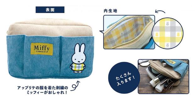 「バッグインポーチ」は、ベージュ×ブルーグリーンの大人っぽいコーデュロイポーチです。表面にはミッフィーの刺繍、内生地にはミッフィーのシルエットが入ったチェック柄がポイント。サイズは約W190×H130×D55mmで、価格は1250円。