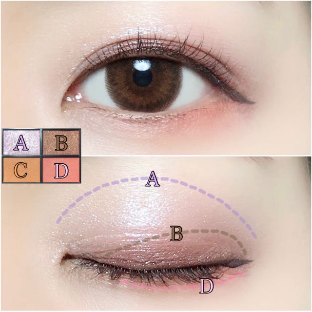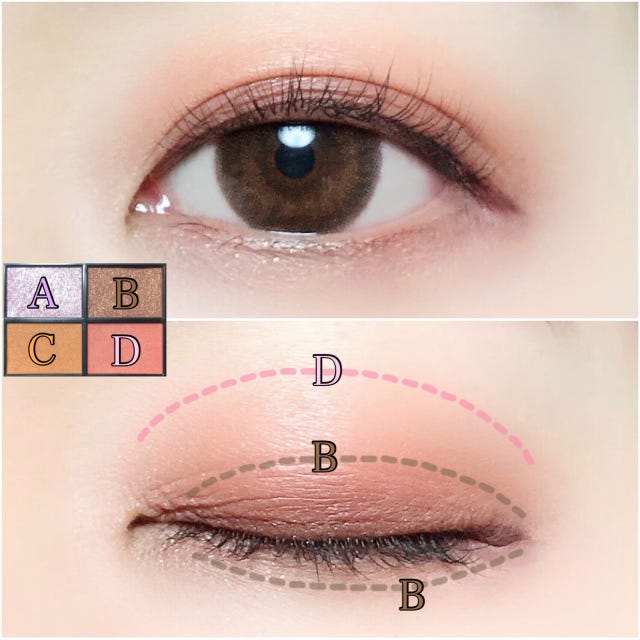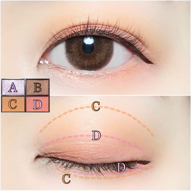 はじめにDのコーラル系カラーをアイホールにふんわり乗せ、アイメイクのベースを作ります。