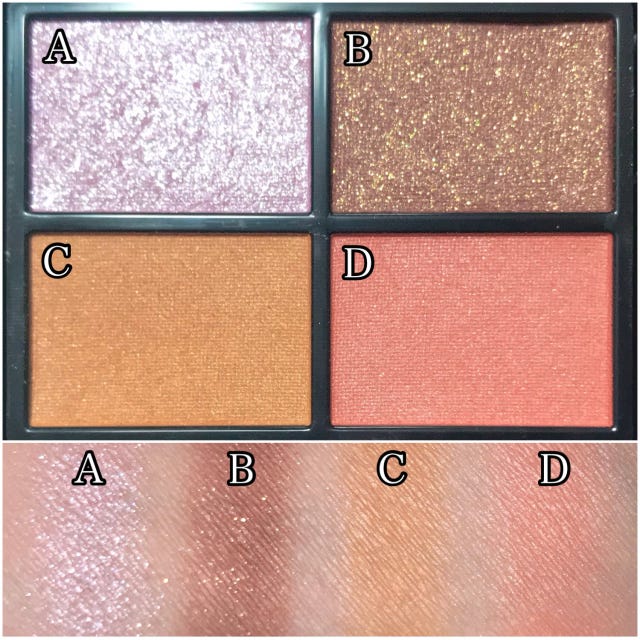マット2色、ラメ、締め色で構成されている4色パレットで、組み合わせによって様々なメイクを作ることができます。