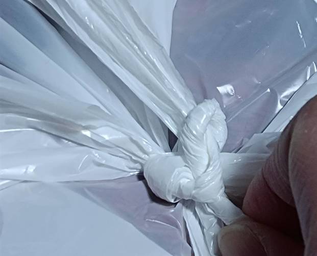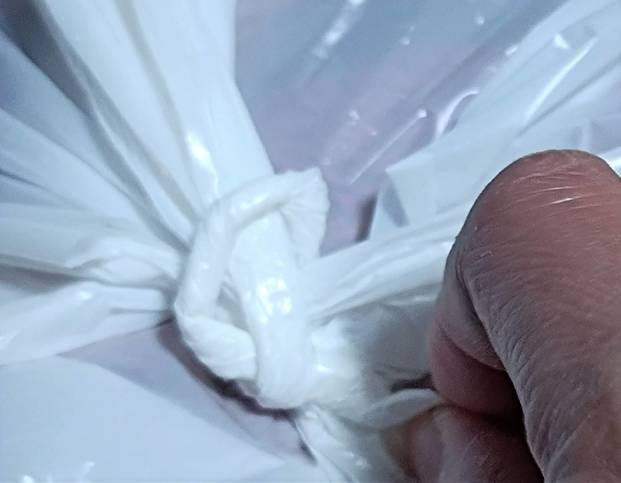 4. すると、結び目の中に固くしたビニール袋が入り、結び目がゆるくなります。あとは手でもほどくことができます。