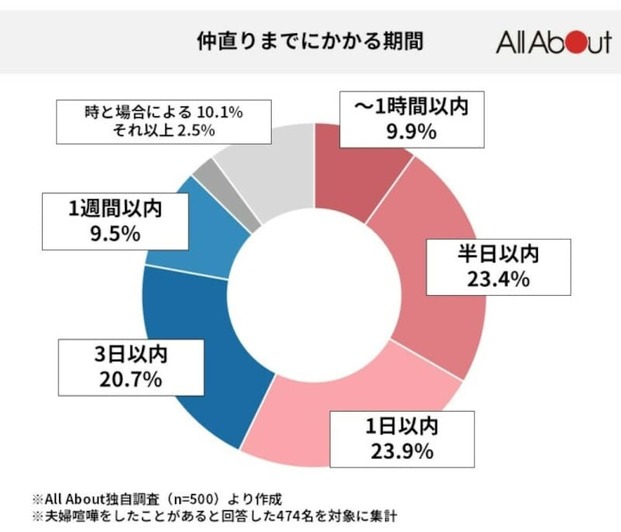 まずは今回のアンケートで「夫婦喧嘩をしたことがある」と答えた474人に聞いた「仲直りする時間は?」の結果はこちら。