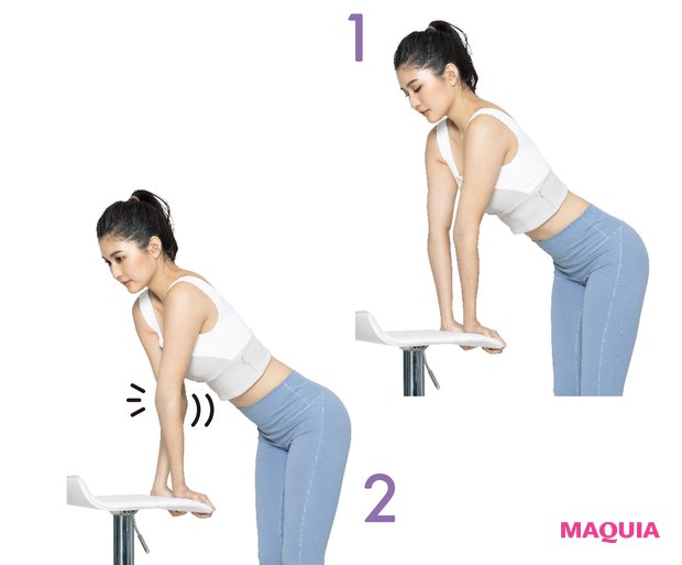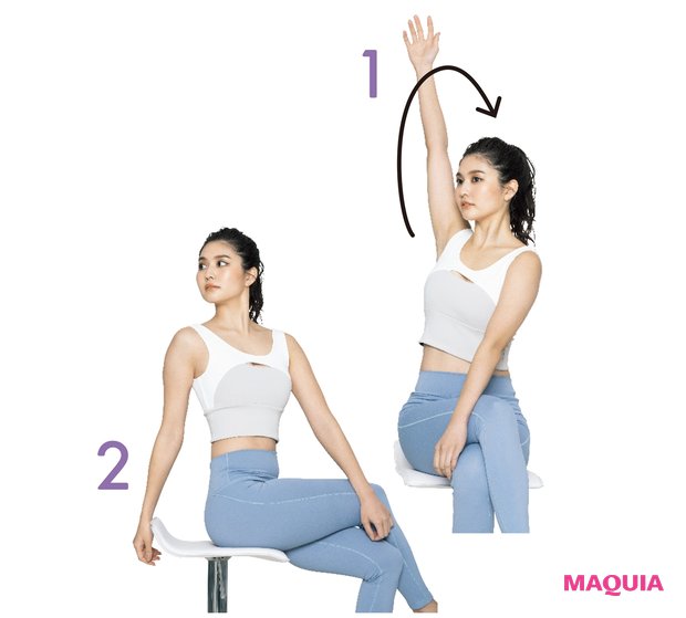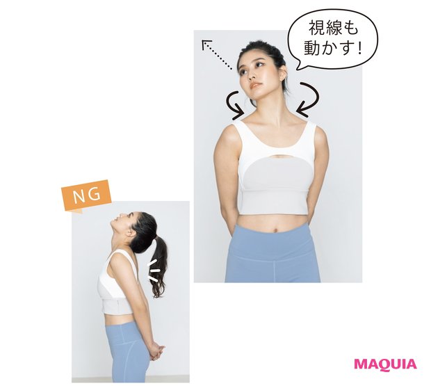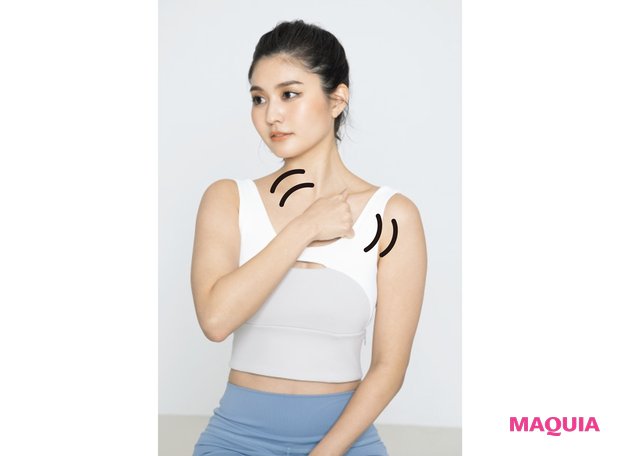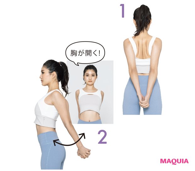 キーボードやスマホを触っているとどうしても前のめりな姿勢に。落ちた肩を戻す動きは、胸も開いて気持ちいい!
