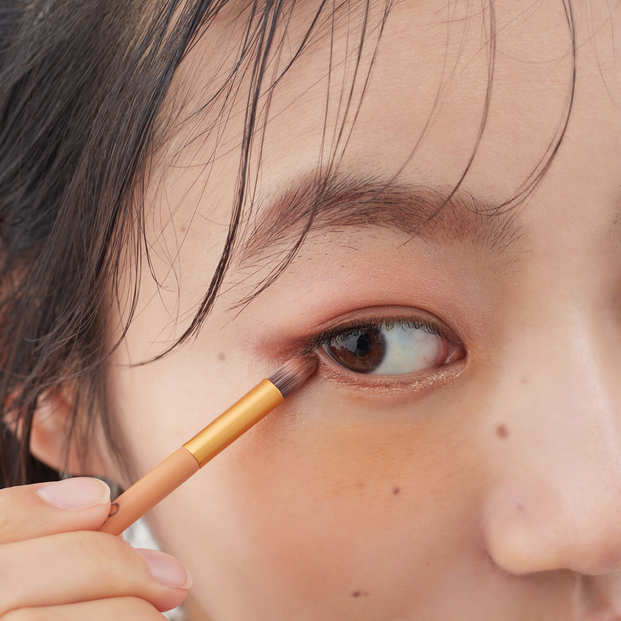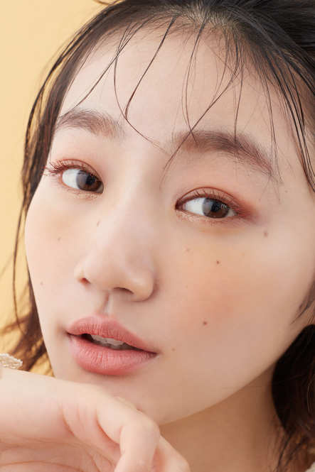 下まぶたにグリッターを幅広くぼかして、涙袋をふっくら強調。目の下に光が集まるので、目元が一気に明るく見えちゃう♡ 下まぶたをキラキラで盛る分、上まぶたは作り込まないのが正解。スマートなマットシャドウ&カーラーなしのマスカラで、メリハリと抜け感を仕込んで!