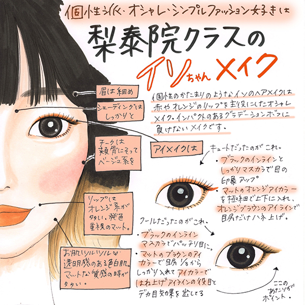 どちらもオレンジリップに組み合わせやすく、一重まぶたならではのアイメイクで「イソちゃん」の魅力を引き出していますよ!