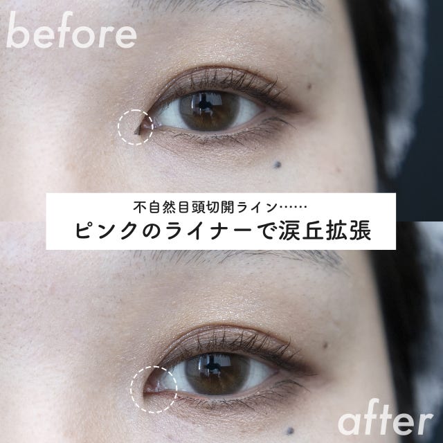 ピンクのアイライナーで目頭の内側を「くの字」に塗りつぶすだけでとても自然な仕上がりになります。
