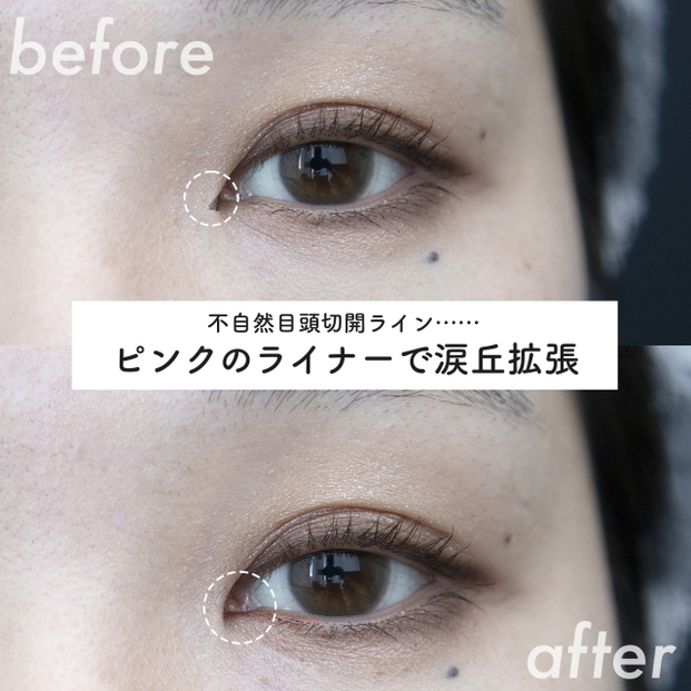 ピンクのアイライナーで目頭の内側を「くの字」に塗りつぶすだけでとても自然な仕上がりになります。