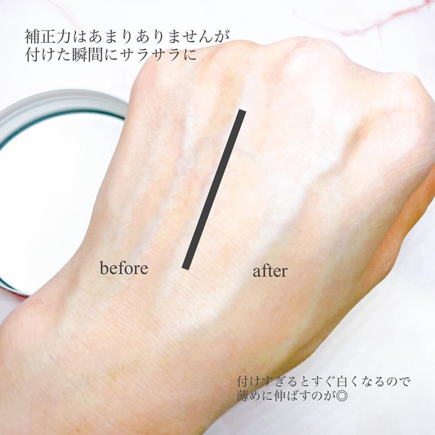 メイク時はもちろん、スキンケア後に使えるのがこのパウダーの大きな特徴。メイクをしないけどすっぴんは避けたい休日や、オフタイムなどにもピッタリです。サラッと肌に整えてくれるので、これからの時期に大活躍間違いなし。