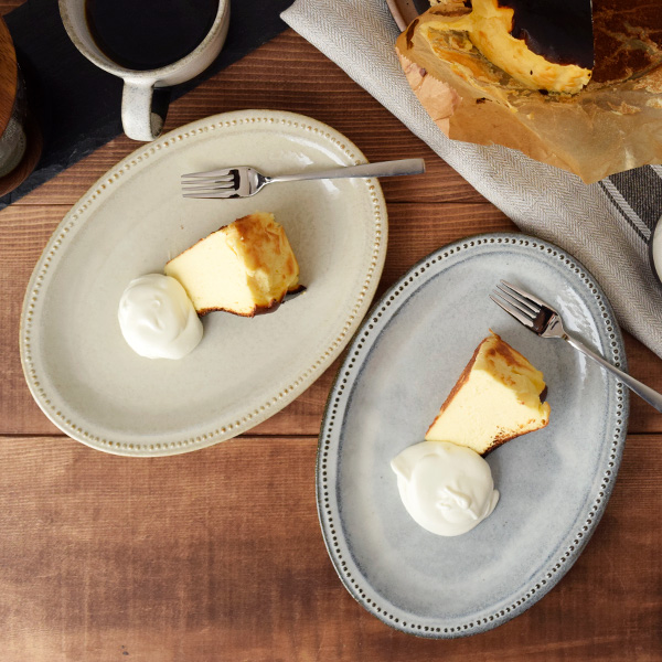 まるでカフェのようなおしゃれなオーバルプレート。ケーキやフルーツを盛り付ければ、おうちカフェが楽しめそう♡土物の風合いを感じる陶器のお皿のため和食を盛り付けても絵になりますよ。