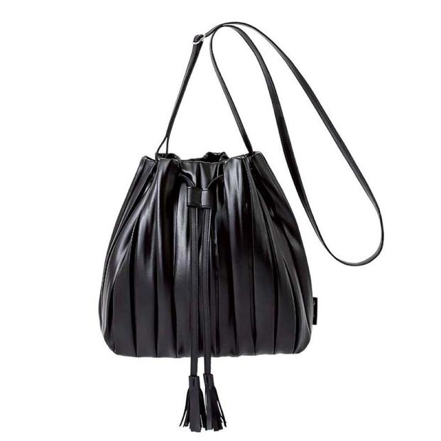 付録は、レザー調の黒いプリーツ巾着バッグです。500mLサイズのペットボトルやA5ノートも入る大きさです。丸みのあるシルエットに太めのプリーツをあしらった大人っぽいデザインが印象的ですね。
