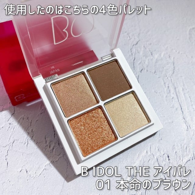 使用したのは、「B IDOL THE アイパレ 本命のブラウン」。ハイライトカラー・べージュ・ブラウンが様々な質感でセットされていて、どんなシーンでも使いやすい4色パレットです。