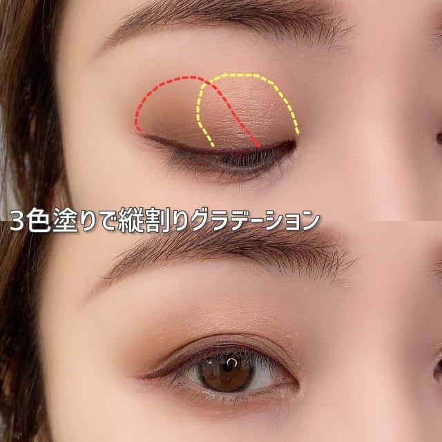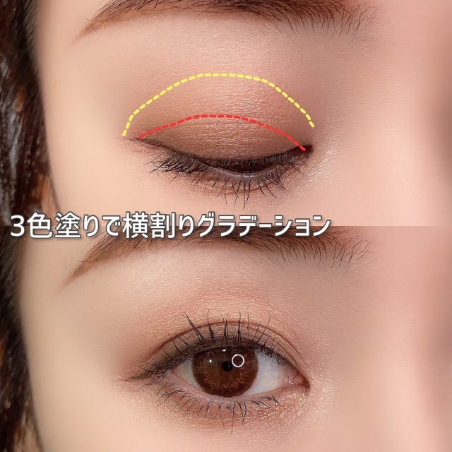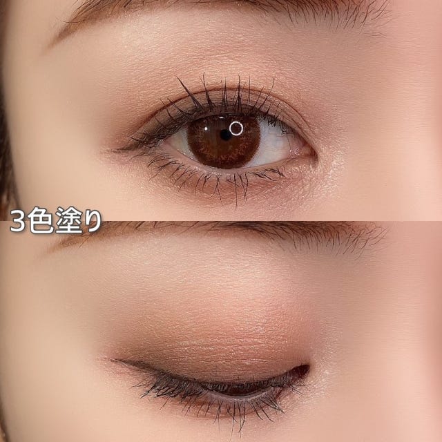 3色塗りは定番の塗り方で、締め色・シェードカラー・ハイライトと、3種類の濃淡カラーでアイホール・目のキワ・ハイライト部分を塗るだけでプロが仕上げたような立体感のある目元になります。