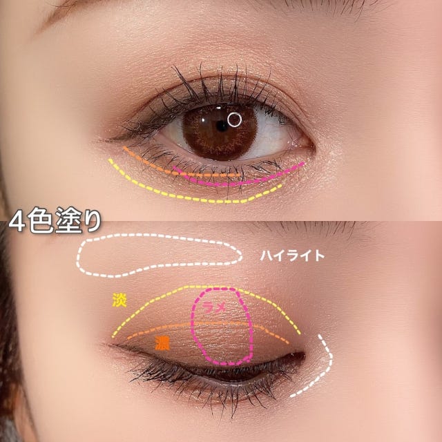 4色塗りになると、基本の3色にプラスしてラメ感のあるカラーや、ポイントになるカラーアイシャドウも入れて華やかな仕上がりを楽しめます。
